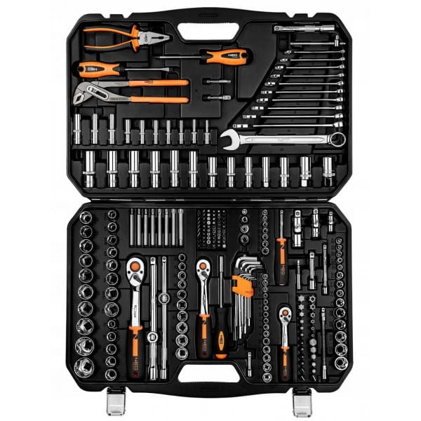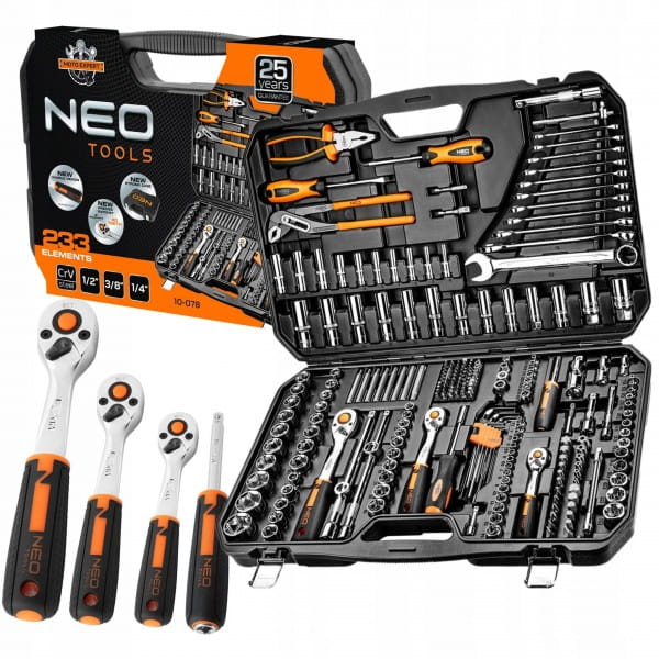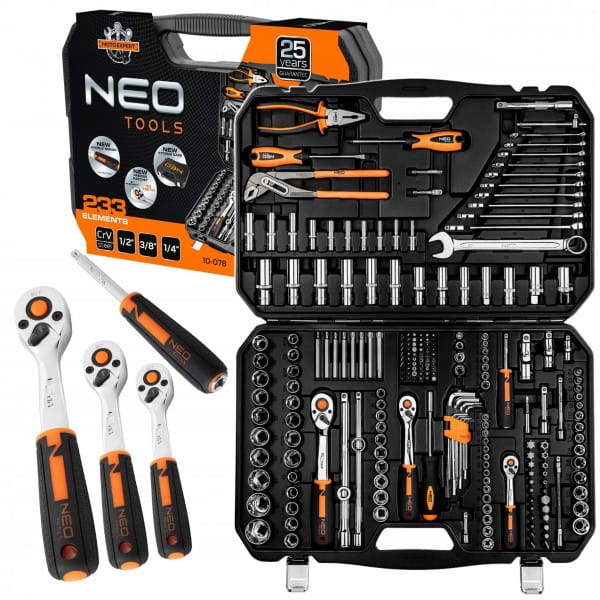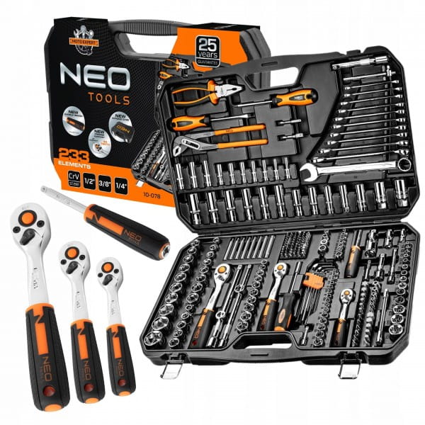Klucze nasadowe ½”, ¼”, 3/8”, zestaw 233 sztuki, 10-078 NEO to wysokiej jakości, imponujący komplet aż 233(!) sztuk produktów, oferowanych w wygodnej walizce z tworzywa sztucznego z metalowymi zatrzaskami oraz poręcznym uchwytem. Pojemny zestaw składa się łącznie na następujące narzędzia oraz akcesoria: