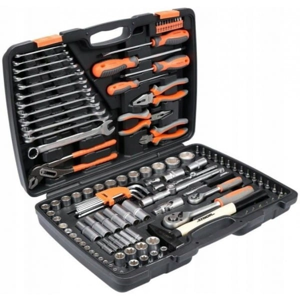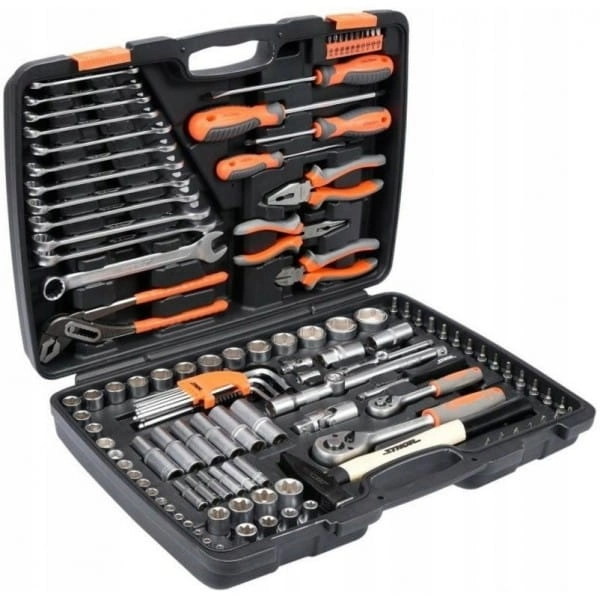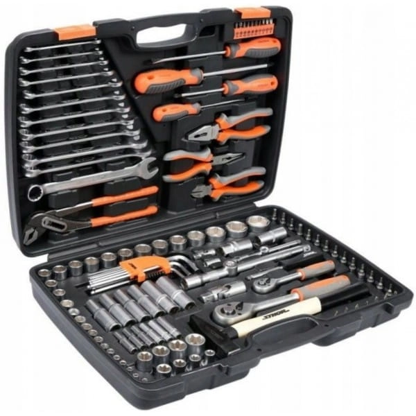 Zestaw narzędziowy STHOR składa się z 122 elementów umieszczonych w wygodnej walizce z tworzywa sztucznego. Narzędzia zostały precyzyjnie wykonane z materiałów zapewniających ich niezawodność.