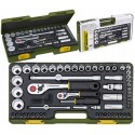 Zestawy kluczy nasadowych w mocnej, powlekanej proszkowo walizce stalowej. Wykonany ze stali chromowo-wanadowej CrV3. Klasyczne narzędzia o sprawdzonej w warunkach warsztatowych wydajności, testowane 100.000 razy.