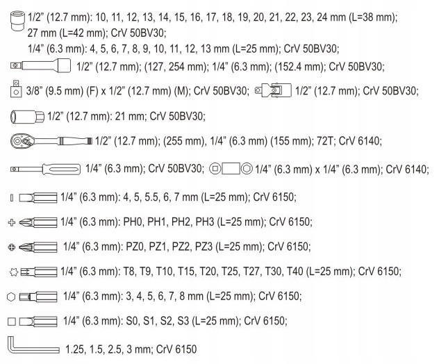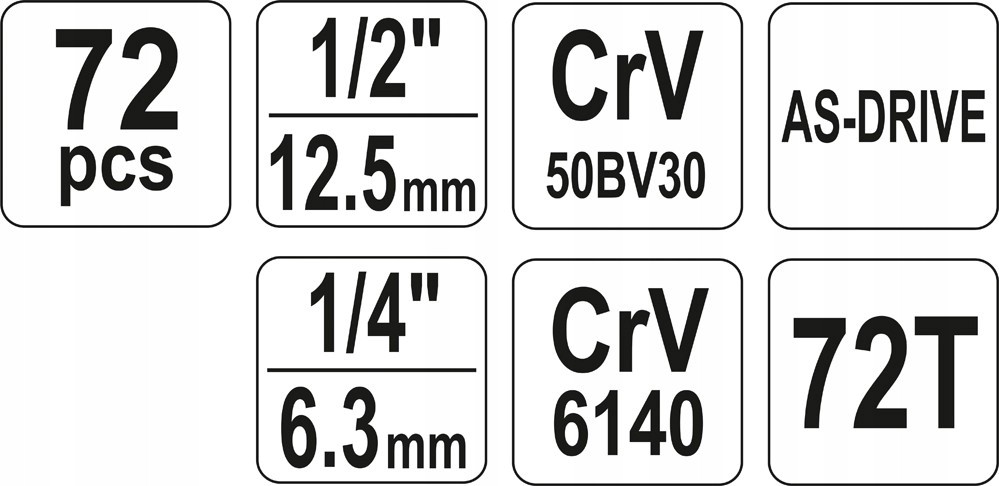 Profesjonalny zestaw narzędziowy, który został opracowany pod kątem potrzeb wyspecjalizowanych serwisów samochodowych i mechanicznych. Klucze nasadowe, jak i napęd nasadek, zostały wykonane z wytrzymałej, narzędziowej stali chromowo-wanadowej CrV 50BV3. Nasadki wyposażone w system AS-Drive, zwiększający maksymalny moment o 25%, przy pełnej ochronie obrzeży nakrętek, nasadki z dwutonowym wykończeniem powierzchni. Nasadki wykonano metodą kucia matrycowego, a przed procesem hartowania poddano je kalibracji za pomocą precyzyjnych przymiarów i urządzeń kontrolnych. Zestaw umożliwia pracę wymagającą bardzo dużych obciążeń i precyzji, pozwala wykonywać wiele czynności serwisowych związanych z odkręcaniem i przykręcaniem połączeń gwintowych o różnych rozmiarach nominalnych. Grzechotki posiadają trójkomponentową rękojeść oraz 72 zęby (skok roboczy 5 stopni).