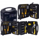 klucze płaskie, nasadowe, grzechotkę, zestaw szczypiec, zaciski, imbusy, nóż, a także wkrętaki i końcówki do bitów.