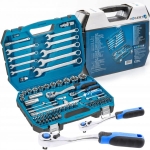 Zestaw 85 elementów ,składa się z kluczy płaskich nasadek, końcówek wkrętakowych i 1/4” i 1/2”,