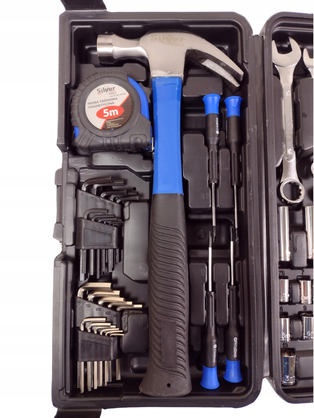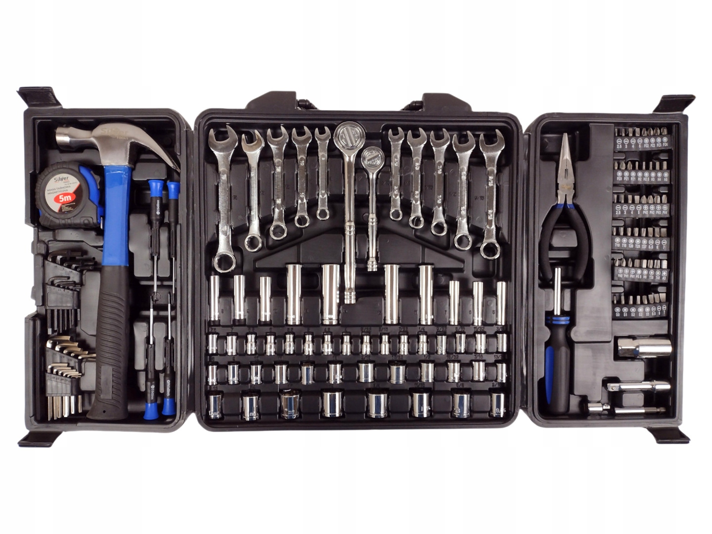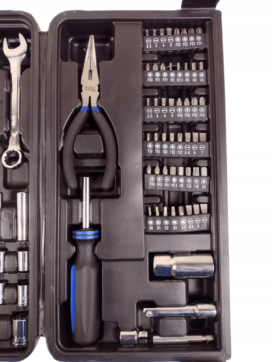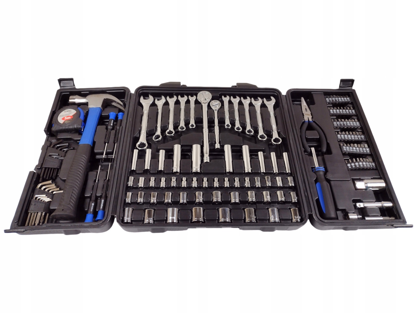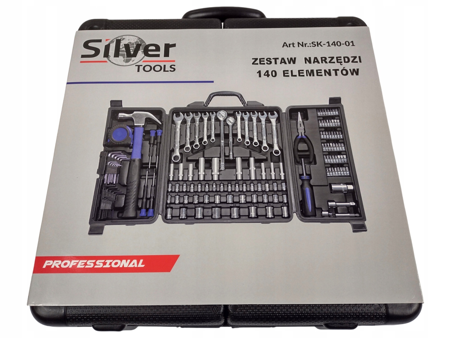 Zestaw skłądający się z 140 elementów w zestawie, w tym szeroki wybór kluczy płaskich, nasadek, bitów oraz akcesoriów. Narzędzia zapakowane są w walizkę, która ułatwia organizację i transport.