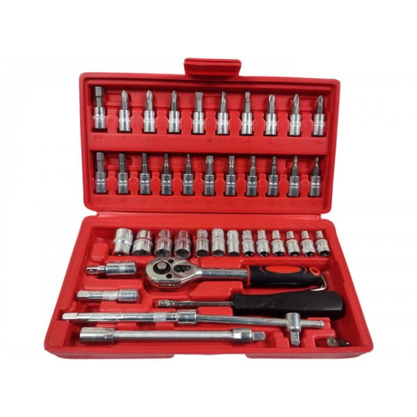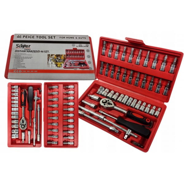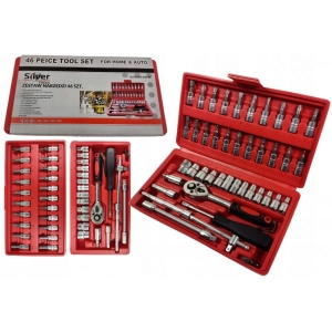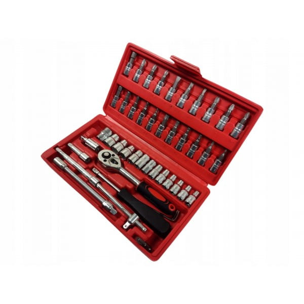 Zestaw kluczy nasadowych składa się z 46 elementów, wykonanych z wysokiej jakości stali chromowo-wanadowej.