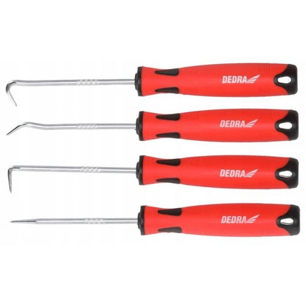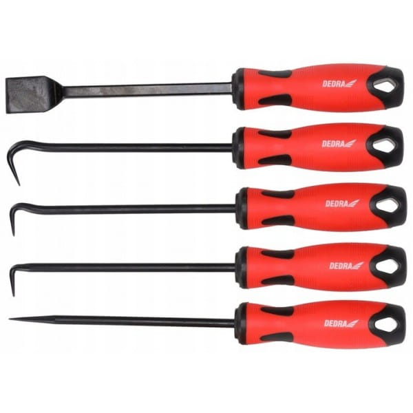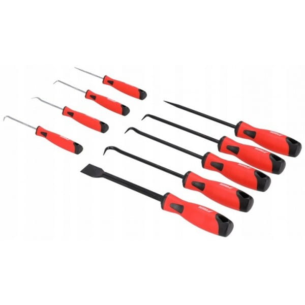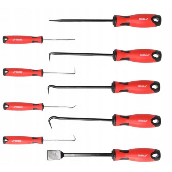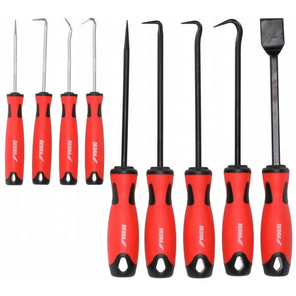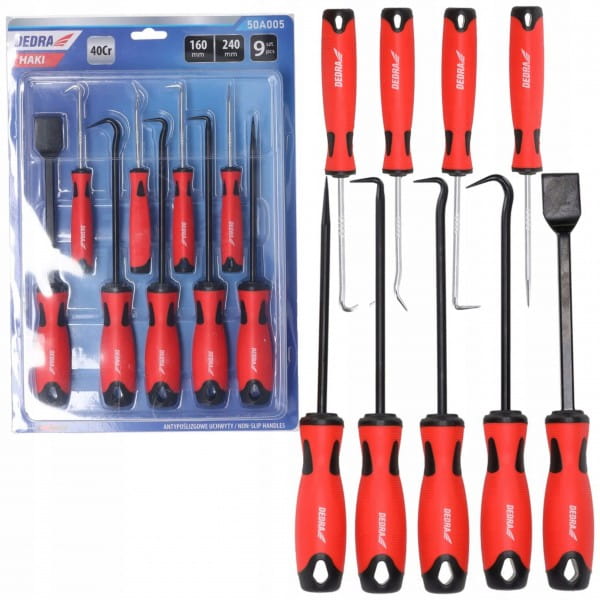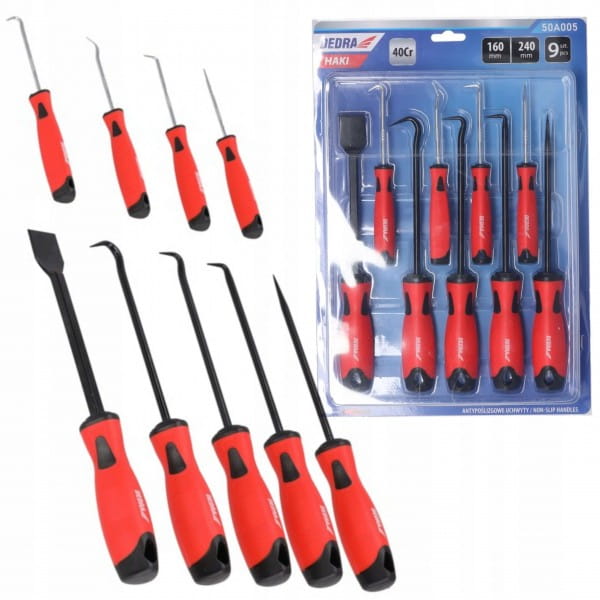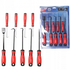 Zestaw 9 sztuk haków z rękojeścią o różnych końcówkach to narzędzia ręczne o szerokim wachlarzu zastosowań od wyjmowania uszczelek po precyzyjne podważanie, przeciąganie czy łączenie elementów wykonanych z różnych materiałów.