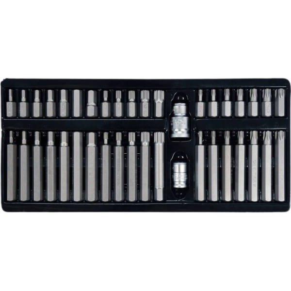 Profesjonalny zestaw bitów, służący do odkręcania śrub specjalnych typu: hex, torx, spline. Różnorodność bitów zapewnia możliwość wykonania wielu prac w specjalistycznych serwisach mechanicznych i samochodowych. Końcówki posiadają dwie długości 30 oraz 75 mm, mocowane w uchwycie sześciokątnym 10 mm, dostosowanym do współpracy z grzechotką 1/2" oraz 3/8".
