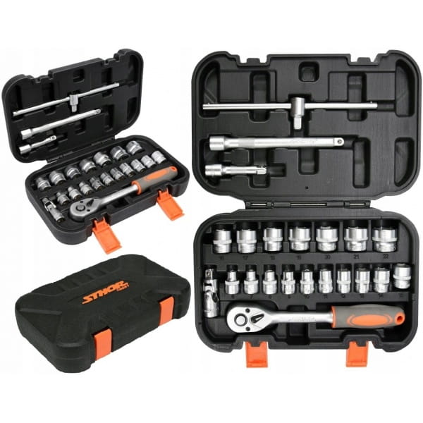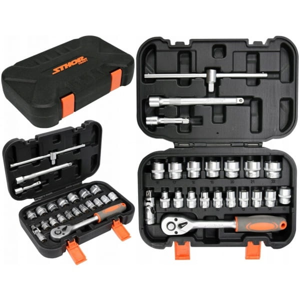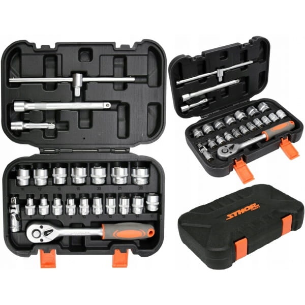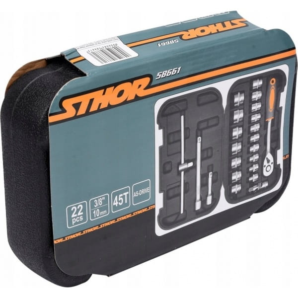 Zestaw narzędziowy STHOR składa się z 22 elementów umieszczonych w wygodnej walizce z tworzywa sztucznego.