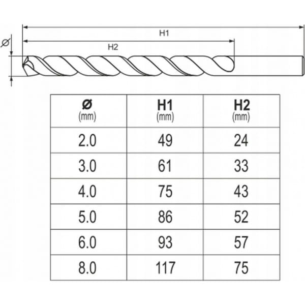 ZESTAW WIERTEŁ DO METALU CO-HSS 6 SZTUK 2-8MM