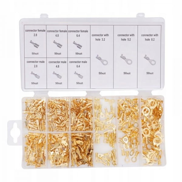 Zestaw zawiera konektory o trzech głównych rozmiarach: 2,8 mm, 4,8 mm i 6,4 mm, co pozwala na elastyczne dopasowanie do różnorodnych potrzeb instalacyjnych. Dzięki solidnemu i wygodnemu opakowaniu, które ułatwia segregację i dostęp do poszczególnych rodzajów konektorów, praca staje się znacznie prostsza i bardziej zorganizowana.